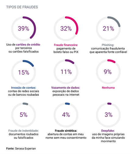 Outras informações da pesquisa mostram que o tipo de golpe mais recorrente relatado pelos entrevistados foi o de “uso de cartões de crédito por terceiros ou cartão falsificado” (39%). Veja, no gráfico a seguir, o detalhamento de modalidades de fraude que os entrevistados mais foram vítimas:
