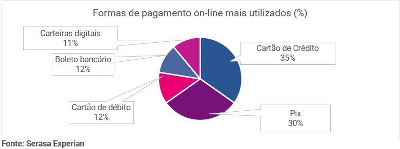 O estudo indicou, ainda, que existem 13 atividades mais comuns em ambientes on-line, das quais nove envolvem transações financeiras. E os métodos mais utilizados para os pagamentos são cartão de crédito (79%) e Pix (69%). Confira os dados completos nos gráficos a seguir: