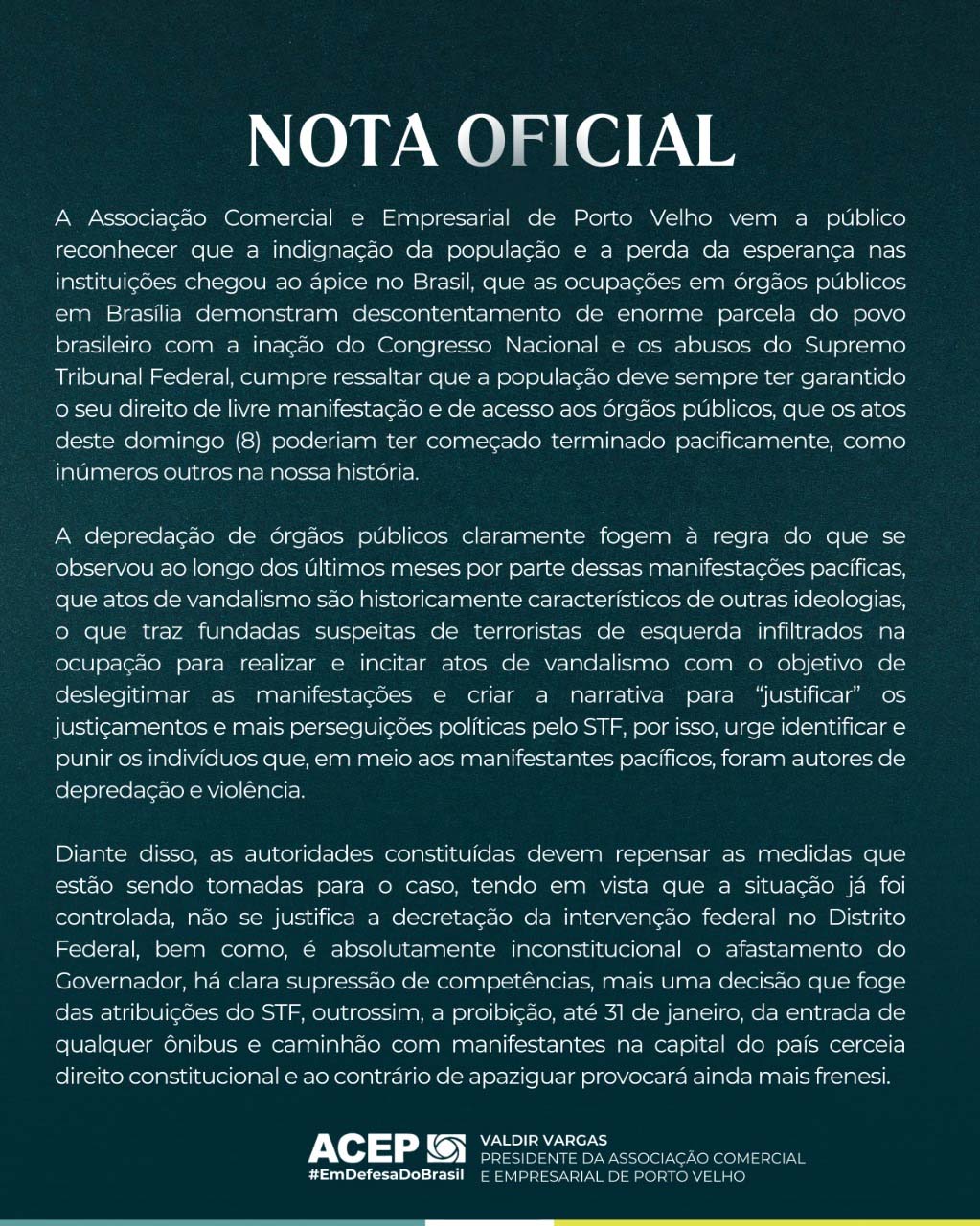 Uma nota tosca e confusa, assinada pela Associação Comercial e Empresarial de Porto Velho (Acep), presidida pelo bolsonarista Valdir Vargas, emitida na última terça-feira, 10, responsabiliza o Supremo Tribunal Federal (STF) e ‘esquerdistas infiltrados’ pelos roubos e destruição do patrimônio público nacional do último domingo, 8.