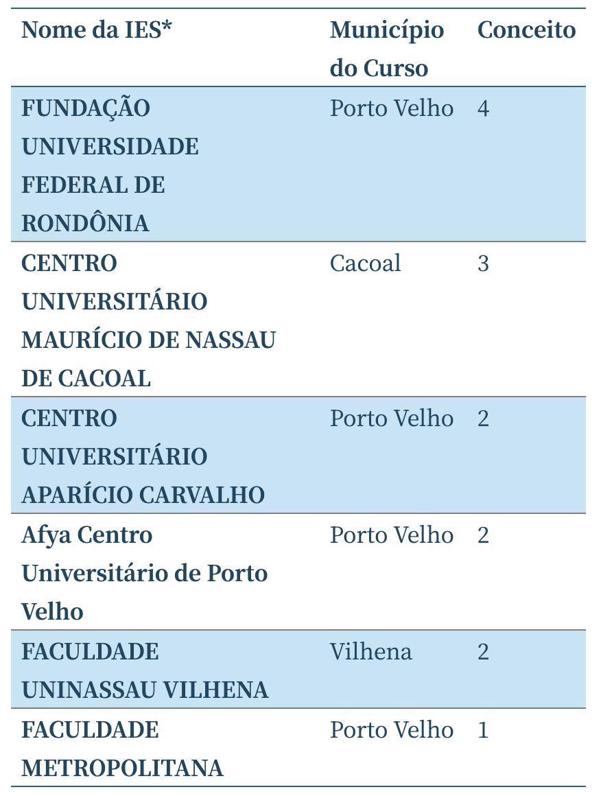 Com desempenho inferior, na faixa do conceito 2, aparecem a Faculdade Integrada Aparício Carvalho (Fimca) de Porto Velho, a Afya Centro Universitário de Porto Velho e a Faculdade Uninassau Vilhena. Na última posição do ranking estadual, com conceito 1, ficou a Faculdade Metropolitana