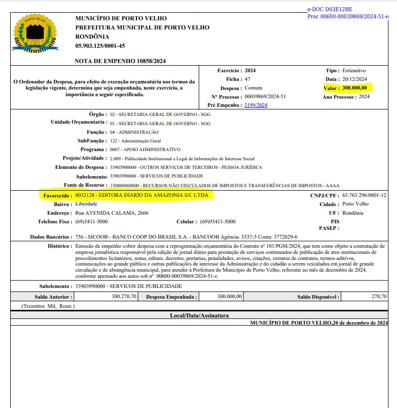 Foi quanto o jornal Diário da Amazônia recebeu da prefeitura de Porto Velho nos últimos três meses de 2024. Os pagamentos foram divididos em R$ 118 mil no mês de outubro, R$ 172 mil no mês de novembro e R$ 300 mil em dezembro. Os valores são referentes a contrato de publicidade. O Tribunal de Contas do Estado abriu procedimento apuratório, vez que o jornal não tem grande circulação para receber tais valores. De acordo com informações, o Diário imprime cerca de 100 exemplares por dia para justificar tais contratos. Abaixo, a nota de empenho de dezembro.