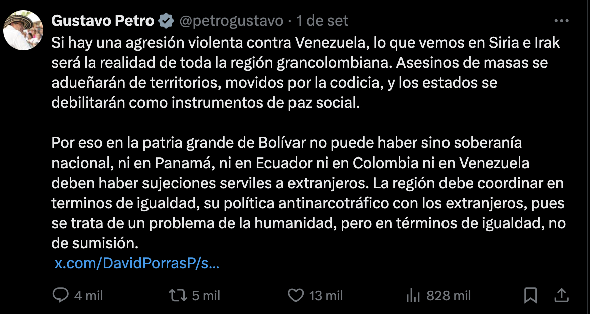 O presidente da Colômbia, Gustavo Petro, declarou em suas redes sociais, “Se houver uma agressão violenta contra a Venezuela, o que vimos na Síria e no Iraque se tornará a realidade de toda a região grã-colombiana. Assassinos em massa tomarão territórios, movidos pela ganância, e os estados se enfraquecerão como instrumentos de paz social. Por isso, na pátria grande de Bolívar, só pode haver soberania nacional. Nem no Panamá, nem no Equador, nem na Colômbia, nem na Venezuela deve haver submissão servil a estrangeiros. A região deve coordenar, em termos de igualdade, sua política antidrogas com os estrangeiros, pois se trata de um problema da humanidade, mas em termos de igualdade, não de submissão”