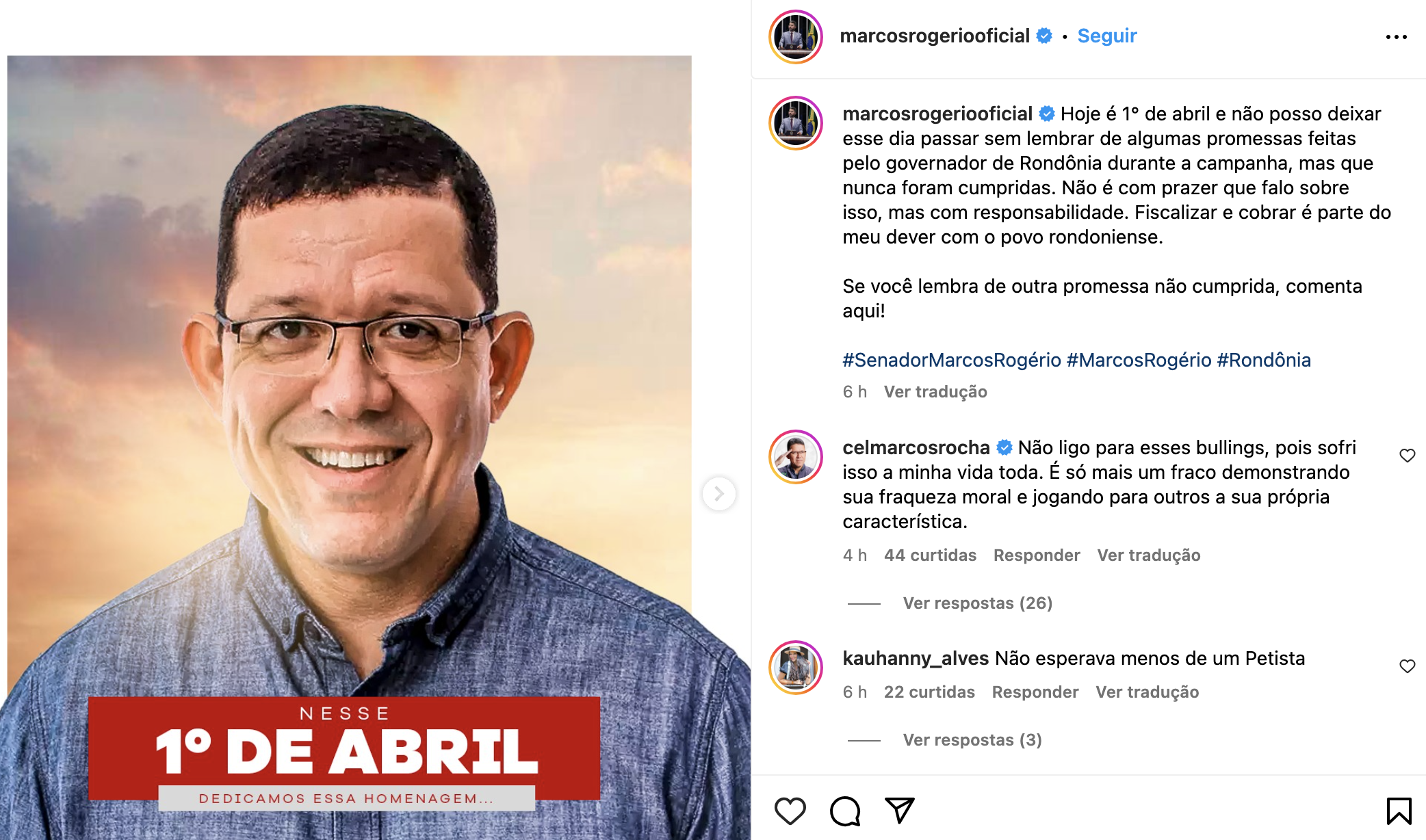 O senador Marcos Rogério aproveitou este primeiro de abril (Dia da Mentira) para provocar o governador Marcos Rocha. Em postagem em seu perfil oficial no Instagram, o senador postou “Hoje é 1° de abril e não posso deixar esse dia passar sem lembrar de algumas promessas feitas pelo governador de Rondônia durante a campanha, mas que nunca foram cumpridas. Não é com prazer que falo sobre isso, mas com responsabilidade. Fiscalizar e cobrar é parte do meu dever com o povo rondoniense. Se você lembra de outra promessa não cumprida, comenta aqui!"