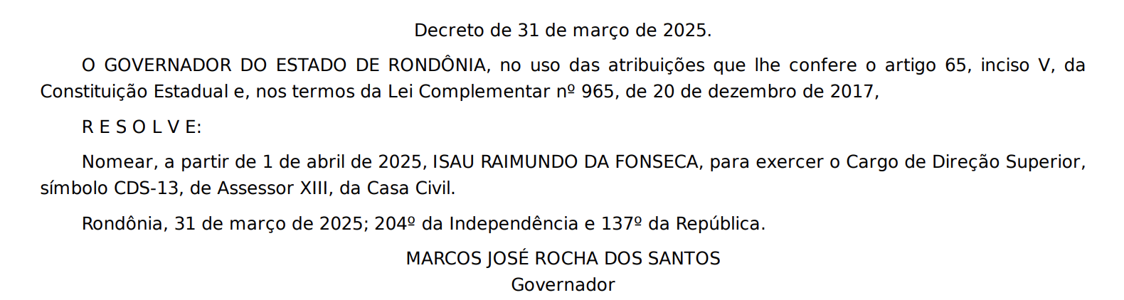 O ex-prefeito de Ji-Paraná, Isaú Fonseca foi nomeado no governo na última segunda-feira como assessor na Casa Civil do governo. Fonseca chegou a ser afastado do cargo por duas vezes, sob as mais diversas acusações, perdeu a eleição mas agora integra as fileiras do governo Rocha. Circula a informação que a indicação teria partido de Lúcio Mosquini, deputado federal (ainda) emedebista que mantém boa relação com o ex-prefeito.