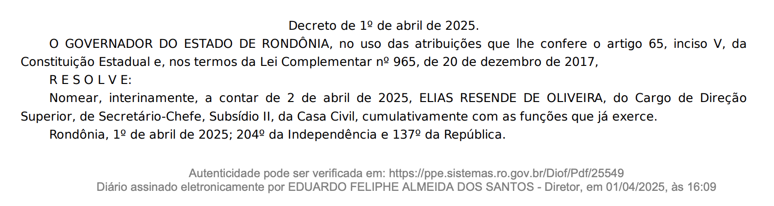 Foi uma longa trajetória, marcada por rumores de intrigas, puxadas de tapete e fofocas diversas. Exatos 50 dias após a exoneração forçada de Júnior Gonçalves, o governador Marcos Rocha oficializou o que todos aguardavam, Elias Resende, seu amigo pessoal e parceiro desde a primeira campanha a governo, para assumir a chefia da Casa Civil. A nomeação foi interina, ele permanece ainda como secretário de Obras acumulando as funções. Na solenidade em que Rocha recebeu de Laerte Gomes o título de cidadão rondoniense, o governador não poupou elogios a Resende, que fez o mesmo. Ali foram dados todos os sinais que sua nomeação seria questão de dias.