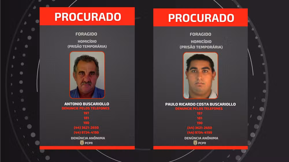 Os principais suspeitos são Antônio Buscariollo, de 66 anos, e Paulo Ricardo Costa Buscariollo, de 22 anos, pai e filho. Ambos têm mandados de prisão em aberto e estão foragidos.