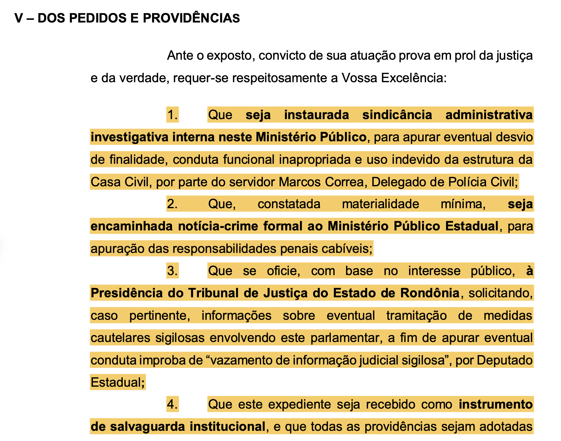 O parlamentar solicita a instauração de uma sindicância administrativa para apurar as condutas do delegado Marcos Correia, a preservação de provas, incluindo a apreensão de seu celular, e a verificação junto ao TJ-RO sobre a existência de medidas cautelares contra ele. A denúncia também pede a apuração de possíveis responsabilidades penais.