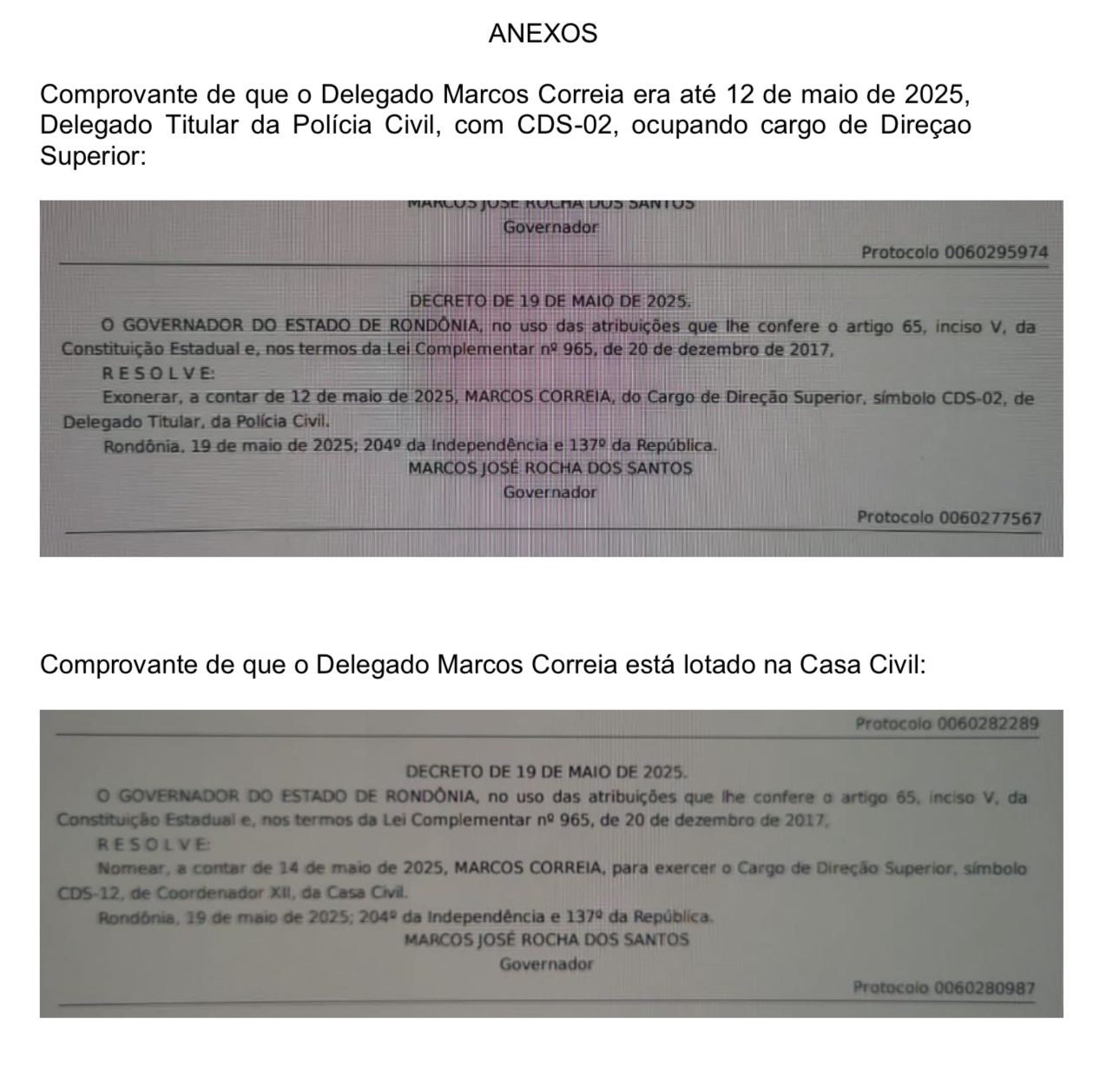 Além disso, Marcelo Cruz relata que, na semana anterior, foi abordado pelo deputado estadual Ribeiro do Sinpol (Patriota-RO), também policial civil, que informou sobre uma suposta operação judicial autorizada pelo Tribunal de Justiça de Rondônia (TJ-RO) contra ele, marcada para 5 de junho, mas suspensa por motivos não esclarecidos. Segundo Ribeiro, a operação seria motivada por acusações de “traição institucional” envolvendo ex-membros do staff do governo, ligados à Casa Civil.