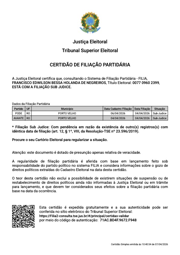 O pré-candidato a deputado estadual por Rondônia Edwilson Negreiros é alvo de apuração por suposta fraude em filiação partidária. Segundo informações apuradas pelo Painel Político, ele assinou ficha no Avante em 4 de abril — prazo final da janela partidária — e, dois dias depois, registrou nova filiação no Podemos com data retroativa. O Avante afirma possuir o documento original (mais abaixo) reconhecido em cartório e deve acionar o corpo jurídico. O caso pode chegar ao Tribunal Regional Eleitoral de Rondônia (TRE-RO) e, se confirmada a irregularidade, resultar na impugnação do registro de candidatura.
