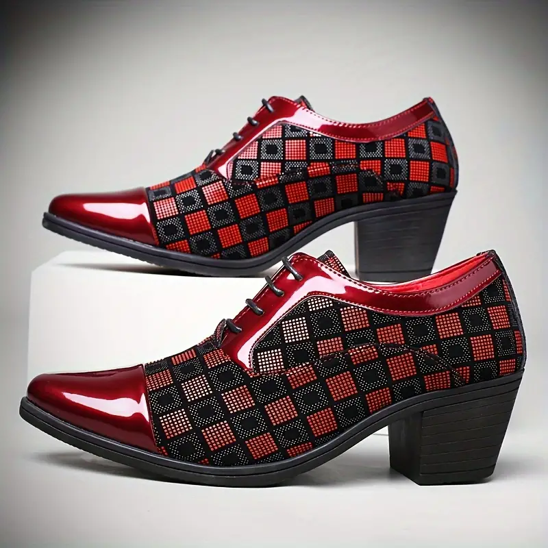 Sapatos Oxford de salto alto xadrez com biqueira para homens, confortáveis e antiderrapantes, com plataforma durável. Ideal para uso em casamentos, festas e eventos - nas cores preto, vermelho e azul - R$313,98