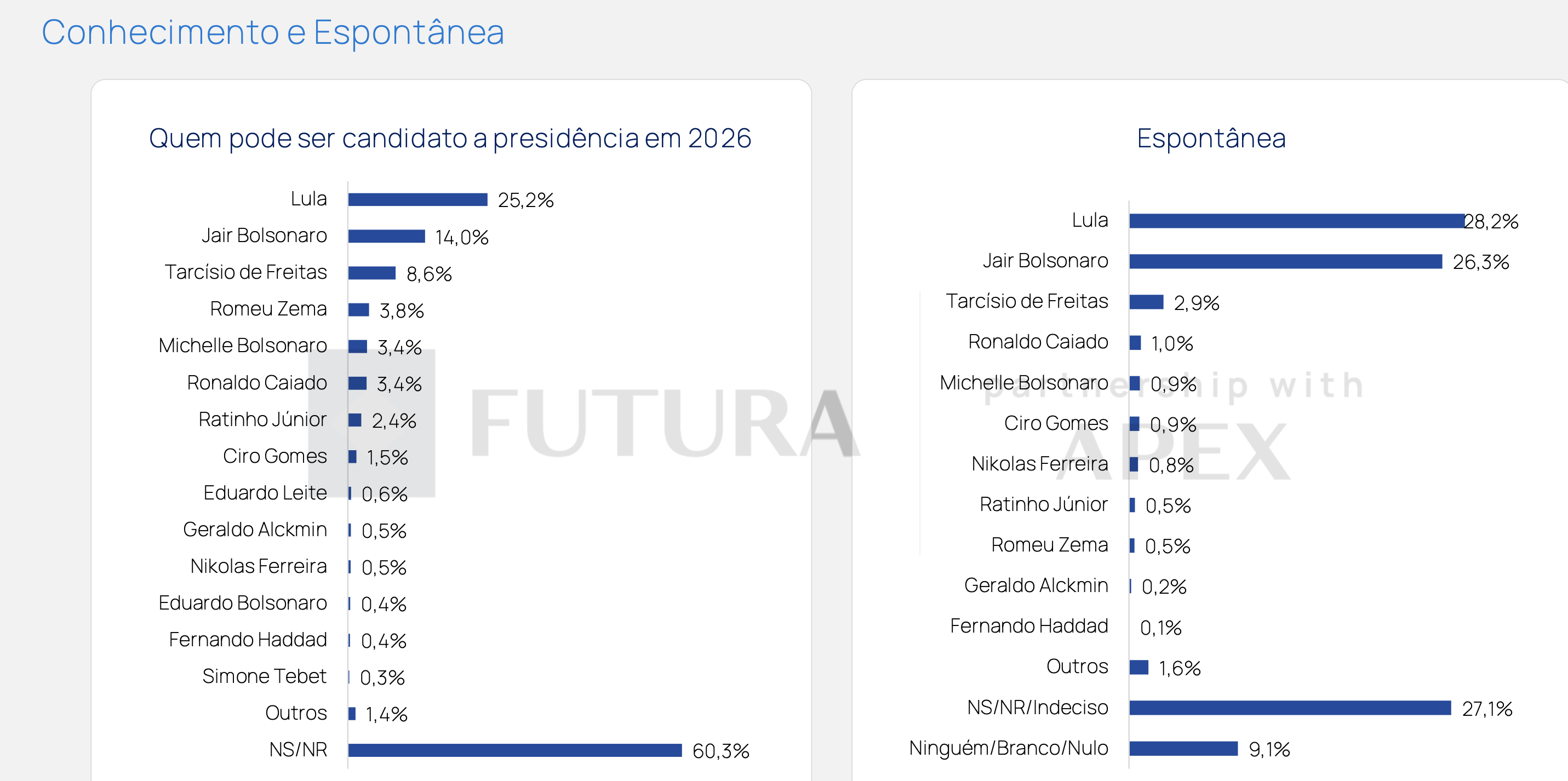 Os dados espontâneos também confirmam a força de Lula (28,2%) e Bolsonaro (26,3%), com Tarcísio de Freitas aparecendo como o terceiro mais lembrado (2,9%). Esses números indicam que, apesar da polarização, há espaço para novos nomes, especialmente de figuras ligadas à direita, como Tarcísio.