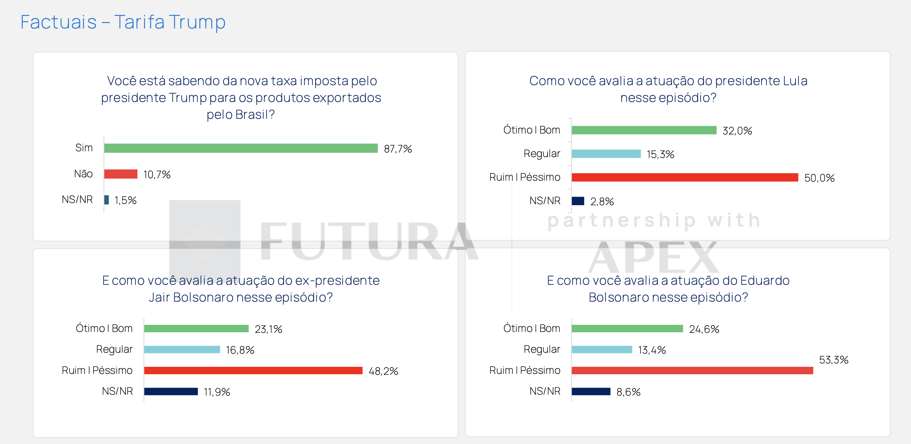 Outro ponto é a nova tarifa imposta pelo presidente dos EUA, Donald Trump, sobre produtos exportados pelo Brasil. 87,7% dos entrevistados estavam cientes da medida. A atuação de Lula nesse episódio foi avaliada como ruim/péssima por 50,0%, enquanto apenas 32,0% consideram ótimo/bom. Jair Bolsonaro e Eduardo Bolsonaro também receberam avaliações negativas, com 48,2% e 53,3% de ruim/péssimo, respectivamente.