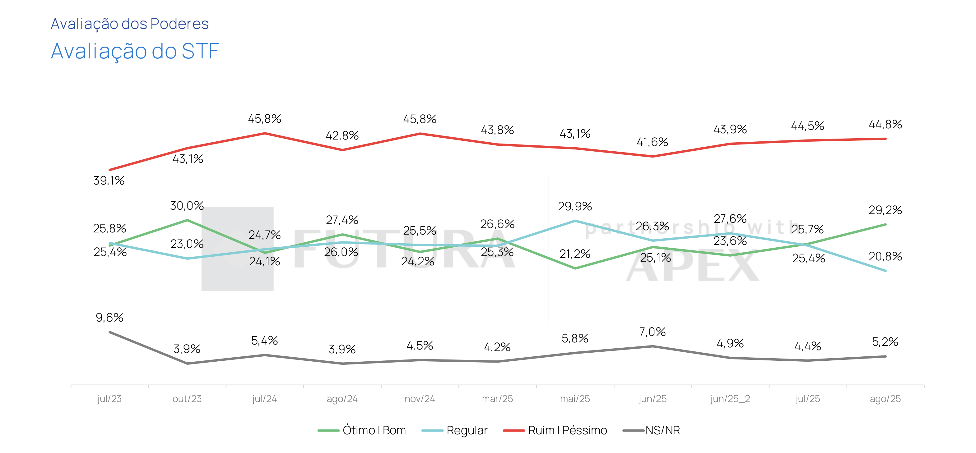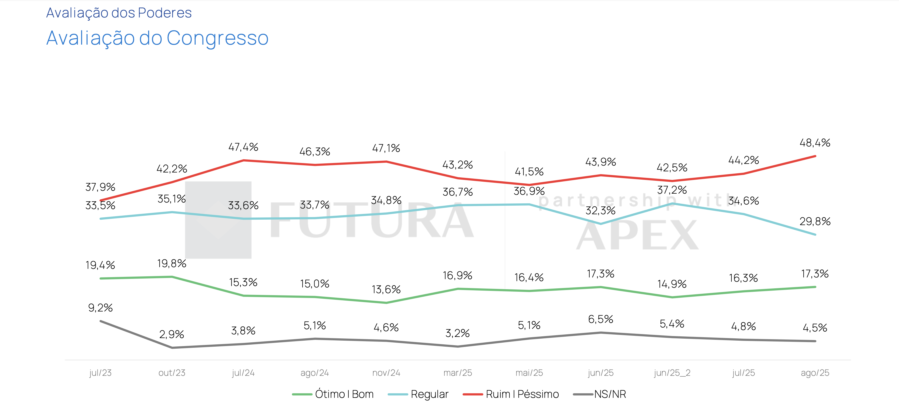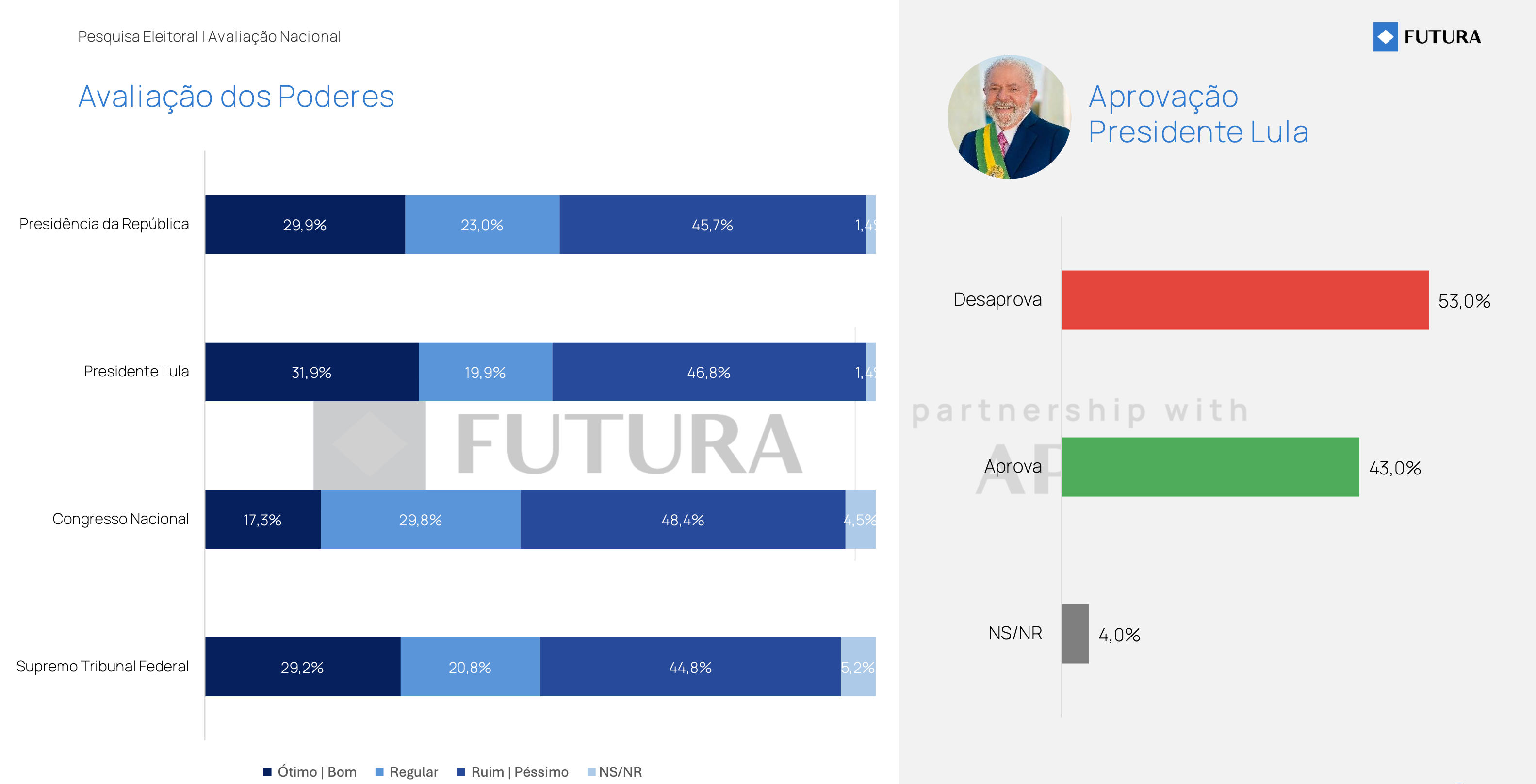 A pesquisa também avaliou a percepção dos eleitores sobre os poderes e o governo. A aprovação de Lula como presidente é de 43,0%, enquanto 53,0% desaprovam sua gestão. A Presidência da República tem avaliação positiva (ótimo/bom) de 29,9%, mas 45,7% classificam como ruim/péssimo. O Congresso Nacional é ainda mais mal avaliado, com apenas 17,3% de ótimo/bom e 48,4% de ruim/péssimo. O Supremo Tribunal Federal (STF) tem 29,2% de aprovação e 44,8% de reprovação.