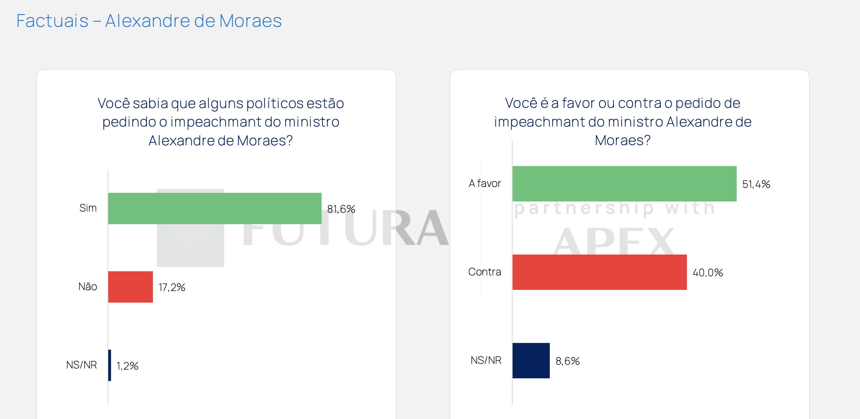 Dois temas factuais chamam atenção na pesquisa. Sobre o pedido de impeachment do ministro do STF Alexandre de Moraes, 81,6% dos entrevistados sabiam da movimentação, e 51,4% são a favor do impeachment, enquanto 40,0% são contra. Esse dado reflete a polarização em torno do STF e pode influenciar o debate eleitoral