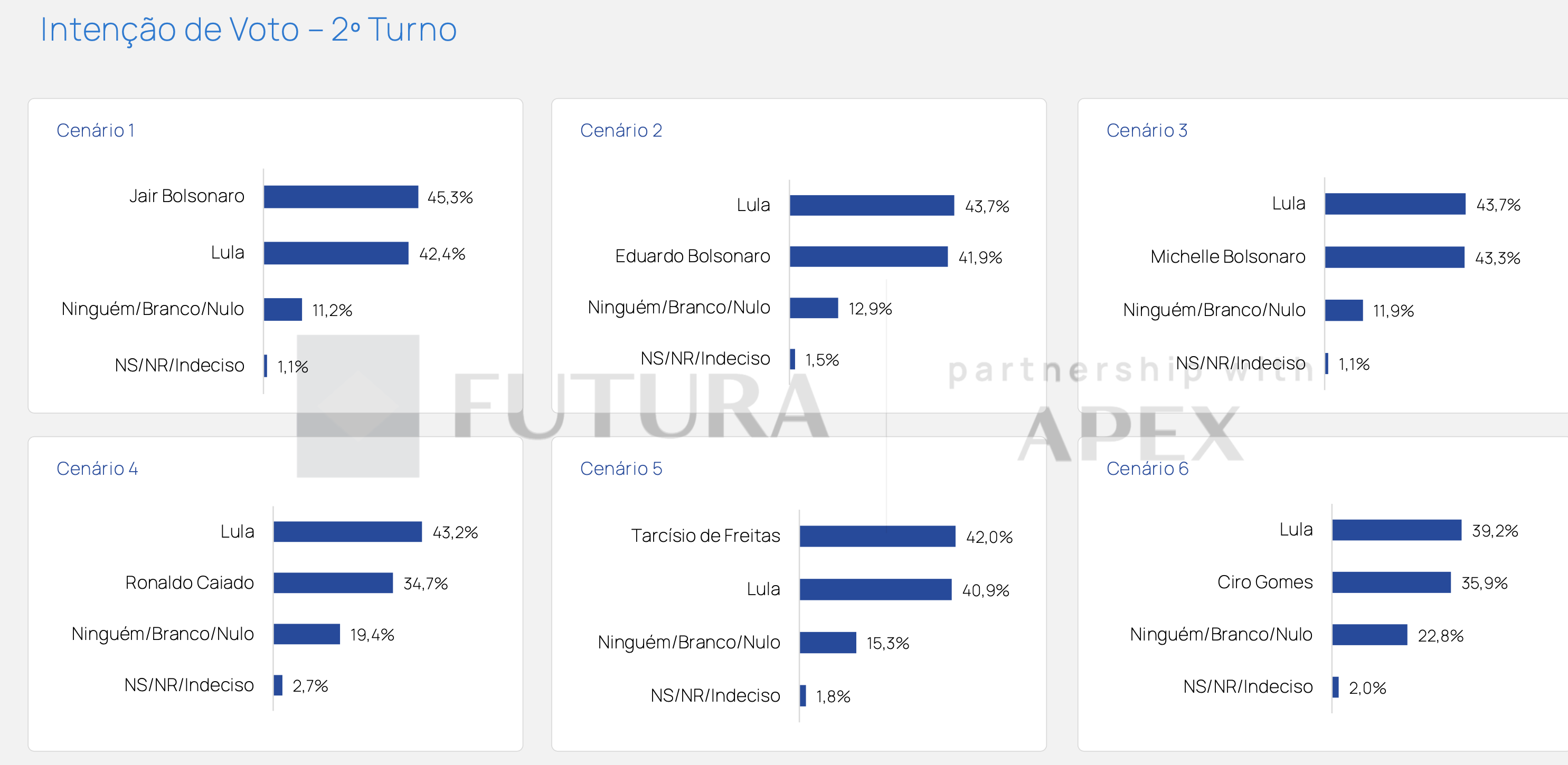 Lula x Jair Bolsonaro: Bolsonaro lidera com 45,3% contra 42,4% de Lula, com 11,2% de votos brancos/nulos. A diferença está dentro da margem de erro, configurando um empate técnico, mas sua inelegibilidade torna este cenário hipotético.