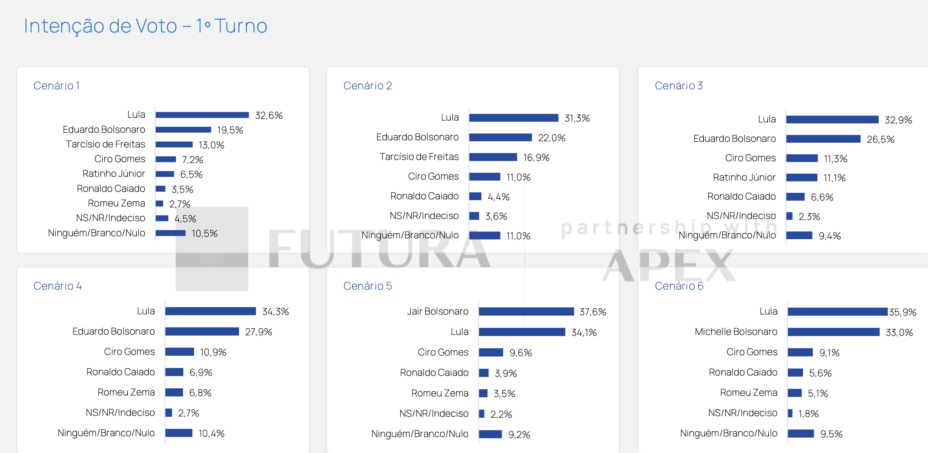 Os cenários de primeiro turno apresentados pela pesquisa mostram Lula e Bolsonaro como os principais contendores, mas com variações dependendo dos candidatos incluídos. Abaixo, detalhamos os principais cenários: