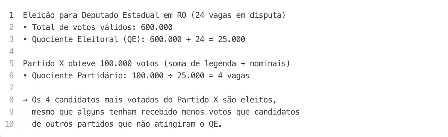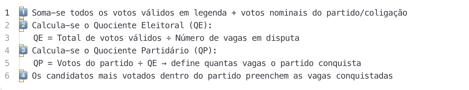 Nas eleições para Deputado Federal, Deputado Estadual e Vereador, o cálculo é mais complexo. Não basta ter muitos votos individuais — é preciso entender a força coletiva do partido ou coligação.