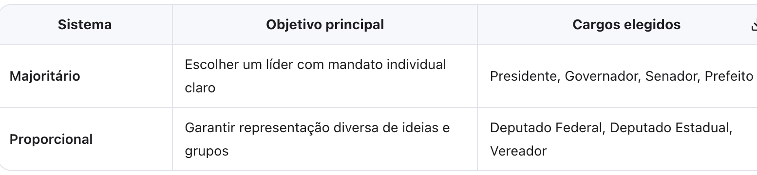 🔄 Comparativo Rápido: Majoritário vs. Proporcional