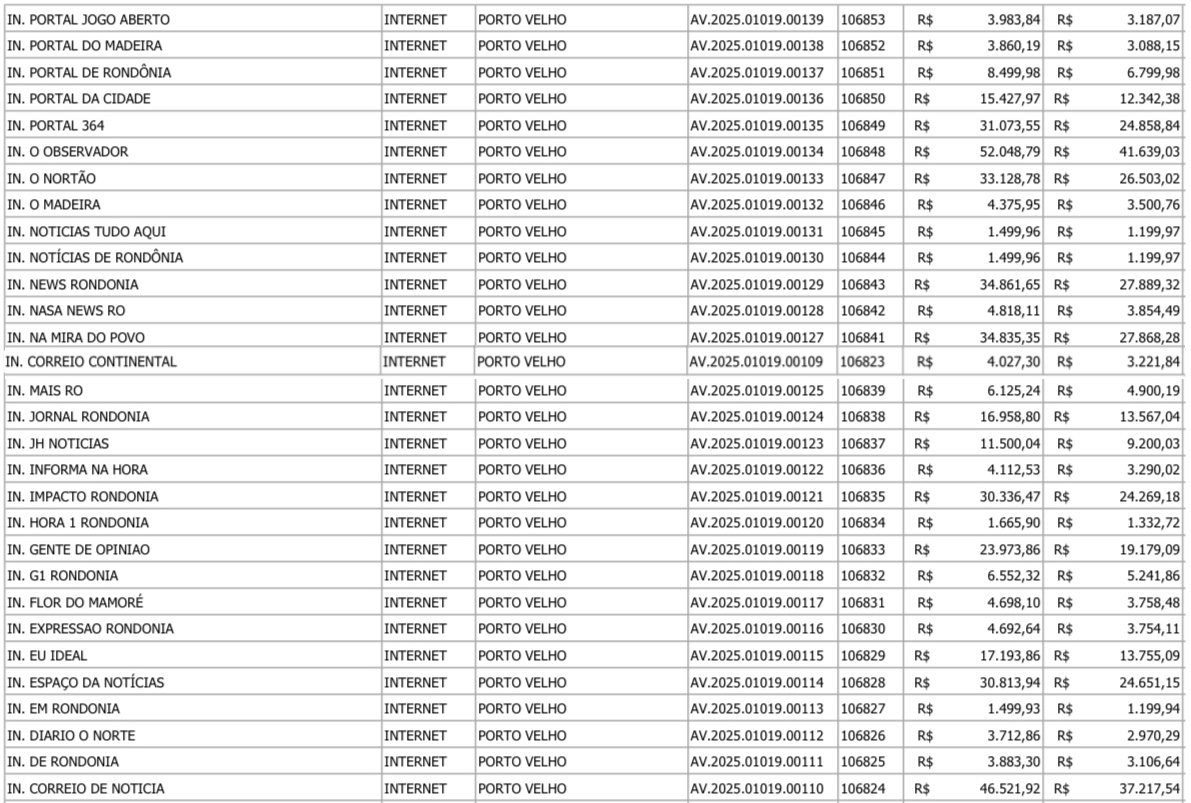 O Rondonia319, por exemplo, receberia R$ 28.387,86, o Primeiro Minuto ficaria com R$ 29.267,48, o Portal364*, que sequer está disponível para acesso por falhas na programação, receberia R$ 29.519,87, e o Alô Rondônia R$ 22.411,00. Para o Rondoniagora, que tem 25 anos no ar, redação consolidada e alta relevância, o governo destinou R$ 6.425,12 e o Tudorondonia, que também é referência, R$ 5.887,52. O Rondoniaovivo, líder de audiência em Rondônia, que conta com equipe de mais de 18 profissionais, sede própria e alta relevância, receberia R$ 29.878,42