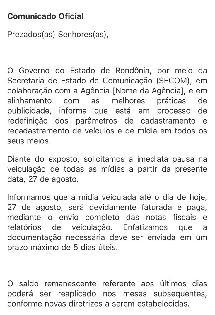 Na noite da última quarta-feira, o secretário de comunicação do governo, Renan Fernandes enviou comunicado a todos os veículos alertando sobre a suspensão da veiculação das campanhas (veja abaixo).