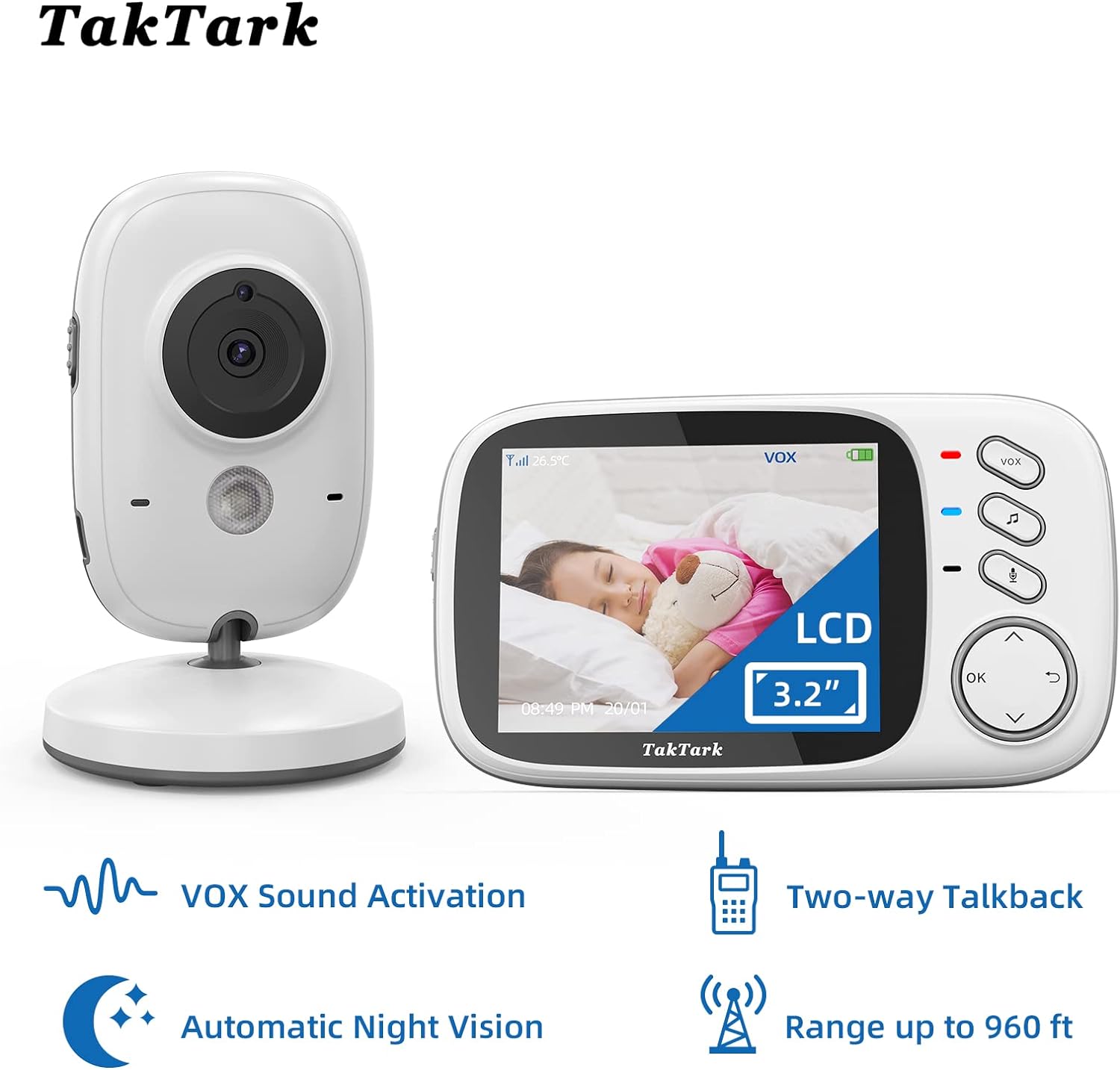 Babá Eletronica Câmera, TakTark 3.2" Monitor de querido com Câmera, Visão Noturna Infravermelha, Áudio Bidirecional, Detecção de Som VOX, Monitoramento Temperatura, Canção de Ninar - R$294,50 - CLIQUE AQUI para comprar ou na imagem: