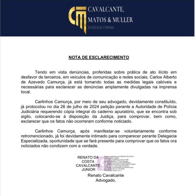 O escritório de advocacia que está na defesa de Carlinhos Camurça, se manifestou afirmando que ele é inocente e que isso será provado no decorrer do processo. Veja a nota: