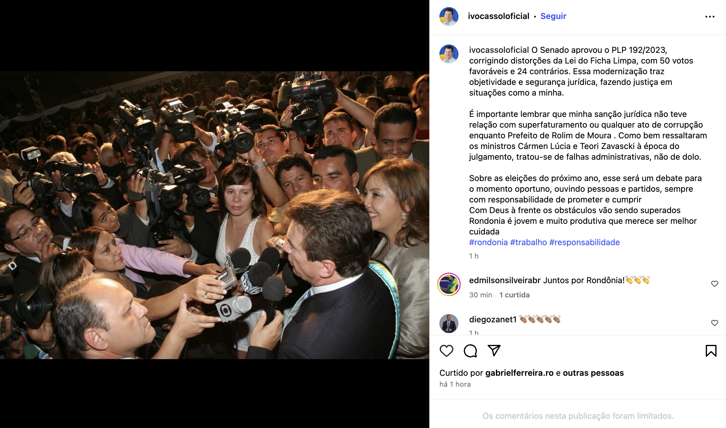 O ex-senador Ivo Cassol (PP-RO) utilizou sua conta pessoal no Instagram para comentar a aprovação, pelo Senado Federal, do Projeto de Lei Complementar (PLP) 192/2023, que modifica a contagem do prazo de inelegibilidade previsto na Lei Complementar 64/1990, conhecida como Lei da Ficha Limpa.