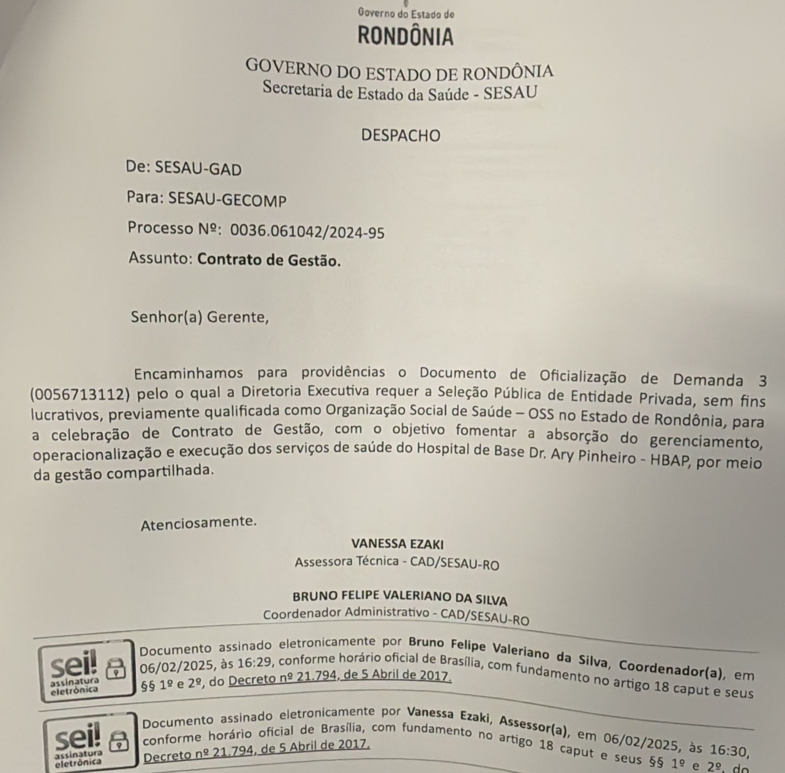 Um documento obtido com exclusividade por PAINEL POLÍTICO, mostra que o governo abriu um chamamento para contratar uma Organização Social (OSS) para gerenciar os serviços do Hospital de Base Ary Pinheiro. Veja abaixo: