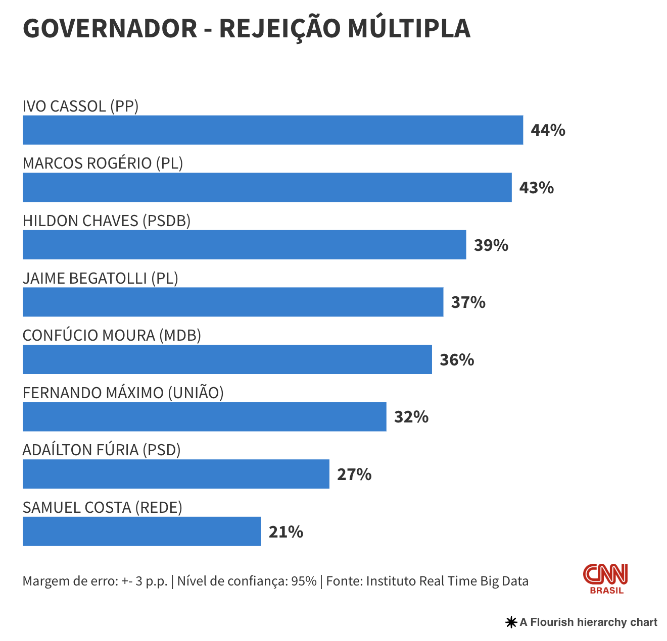 Para efeito de comparação, em outro estado, uma pesquisa recente mostrou que o senador Omar Aziz (PSD) liderava índices de rejeição — 41% — entre pré-candidatos ao governo do Amazonas.