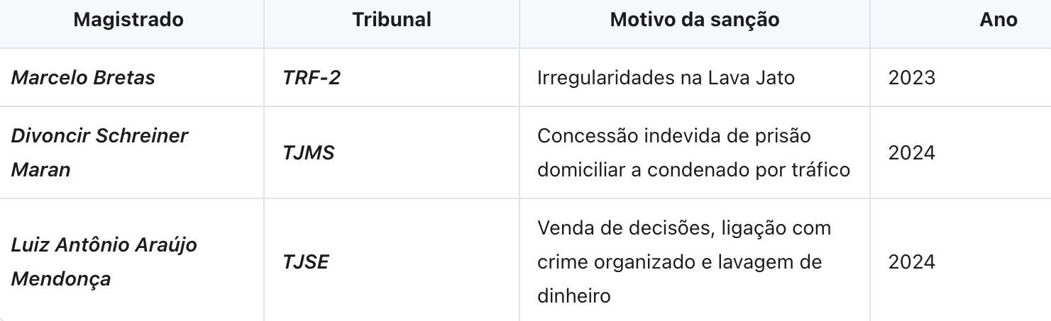 A pena foi aplicada em casos de alto impacto, como ao juiz federal Marcelo Bretas, da 7ª Vara Federal do Rio de Janeiro, afastado em 2023 e aposentado compulsoriamente por irregularidades na condução de processos da Operação Lava Jato.