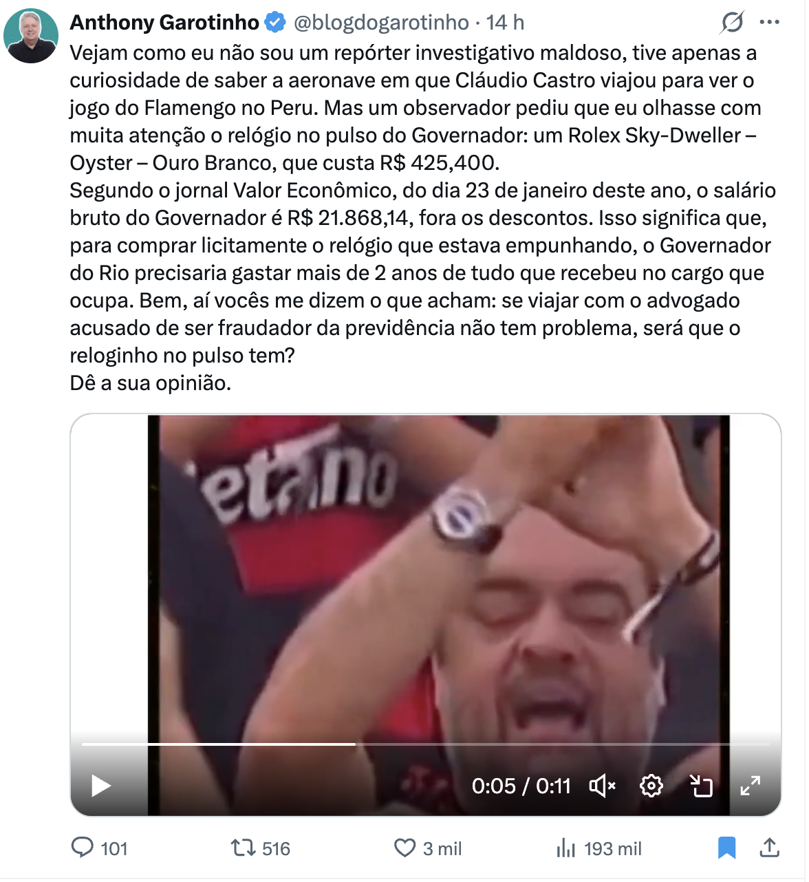 Palavras-chave: Cláudio Castro, Anthony Garotinho, Rolex Sky-Dweller, viagem Peru Flamengo, salário governador Rio, transparência gastos públicos, Copa Libertadores 2025, PL Rio de Janeiro, Alerj, Valor Econômico.