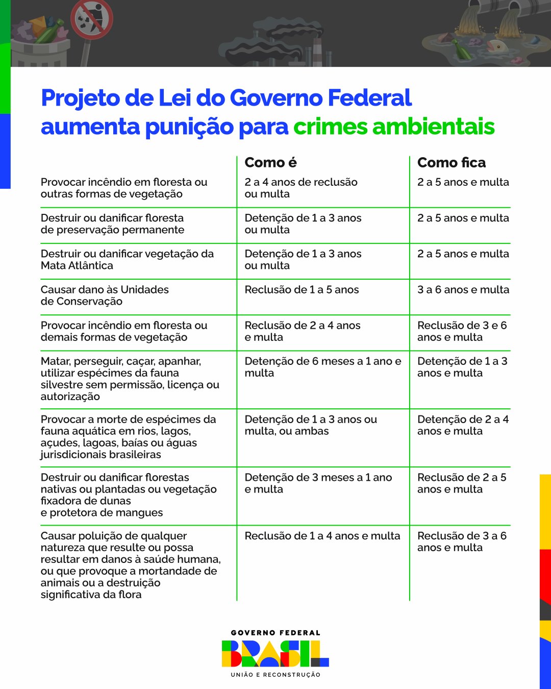O presidente Luiz Inácio Lula da Silva encaminhou ao Congresso Nacional o Projeto de Lei que altera a Lei nº 9.605, de 1998, para aumentar as sanções penais e administrativas derivadas de condutas e atividades prejudiciais ao meio ambiente. O envio do despacho ocorreu após reunião com a ministra do Meio Ambiente e Mudança do Clima, Marina Silva, e o ministro da Justiça, Ricardo Lewandowski, nesta terça-feira, 15 de outubro.