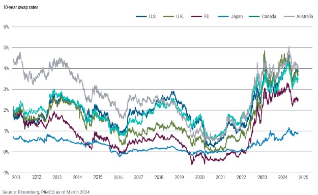 No entanto, a trajetória de redução das taxas da Fed poderá ser mais gradual devido à persistência de alta da curva futura de juros de 10 anos, que pode ser observada no gráfico extraído da PIMCO, a gestora líder mundial em renda fixa, com administração de US$ 1,9 trilhão em ativos: