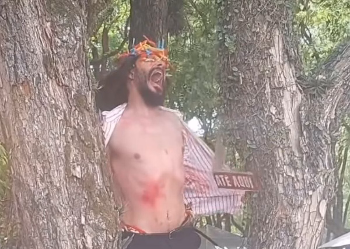 Ao som de uma marchinha com os versos "Vamos tirar, vamos tirar, vamos tirar Jesus da cruz", o performer executou a apresentação no topo de uma árvore, sendo posteriormente carregado pela multidão presente no local.