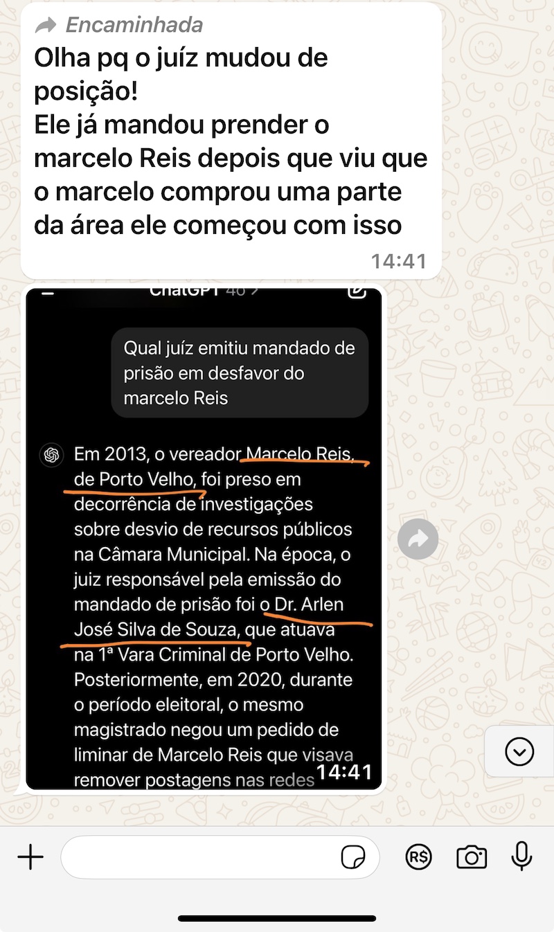 A mensagem que circula em grupos de Whatsapp, sugere que o magistrado teria determinado a prisão do ex-vereador de Porto Velho, Marcelo Reis, um dos alvos da Operação Apocalipse “depois que viu que o Marcelo comprou uma parte da área ele começou com isso”. A mensagem se refere a uma área de terras situada na margem esquerda do Rio Madeira, que pertence ao ex-vereador que está em litígio e o magistrado é responsável pelo processo, de interesse também do vereador eleito Pastor Bruno Luciano.