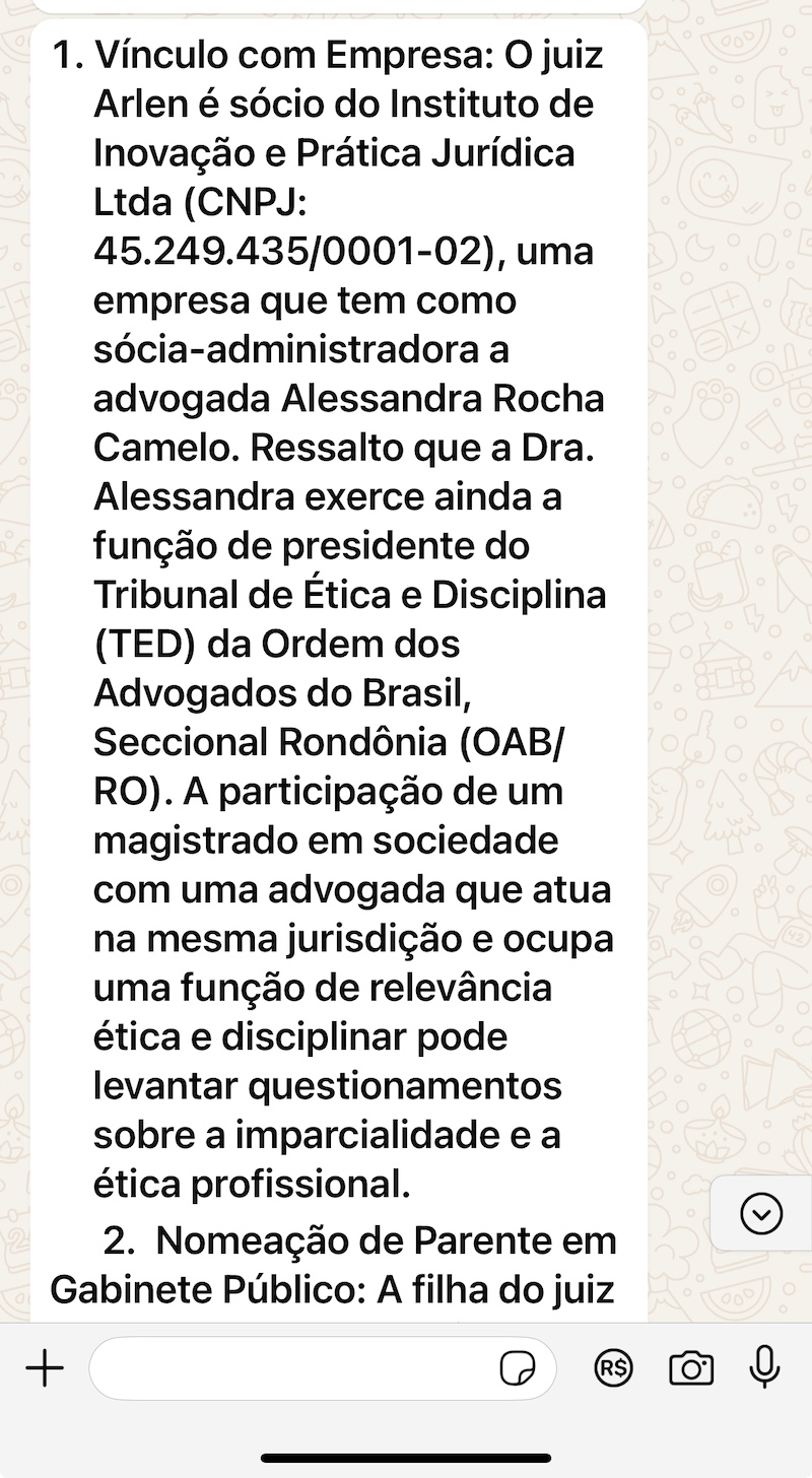 De acordo com a mensagem, o magistrado seria “sócio do Instituto de Inovação e Prática Jurídica Ltda (CNPJ: 45.249.435/0001-02)”, uma empresa que tem como sócia-administradora a advogada Alessandra Rocha Camelo, que é presidente do Tribunal de Ética e Disciplina (TED) da Ordem dos Advogados do Brasil, Seccional Rondônia (OAB/RO). Em pesquisa sobre o CNPJ, PAINEL POLÍTICO confirmou a participação no quadro societário da empresa, sediada em Rio das Ostras, região da baixada litorânea do Rio de Janeiro desde 2022 e tem como principal atividade, “Treinamento em desenvolvimento profissional e gerencial".