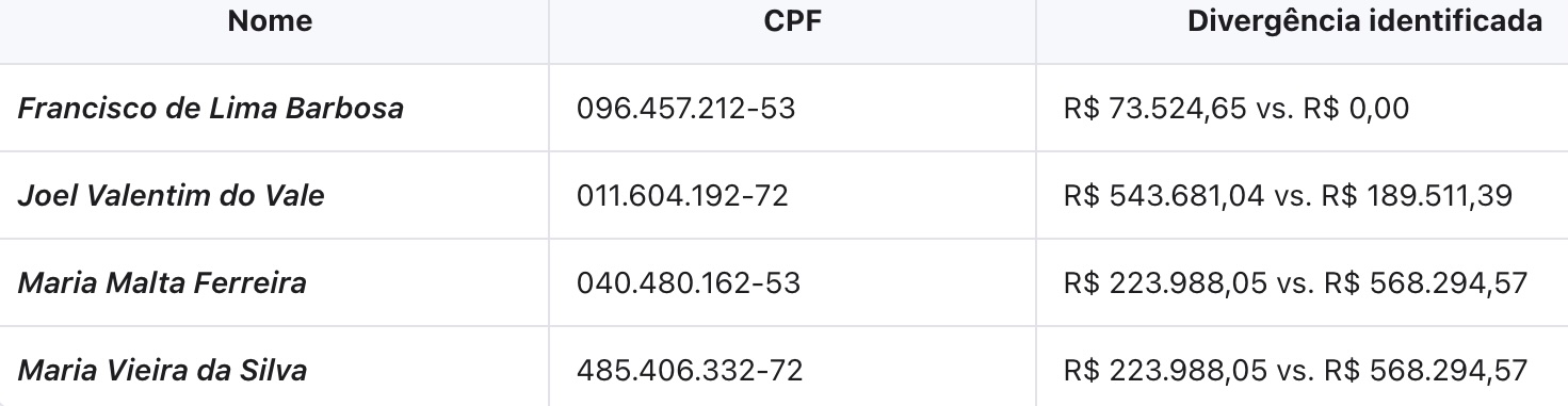 Além disso, a magistrada apontou inconsistências e possíveis duplicidades em registros de outros beneficiários, como: