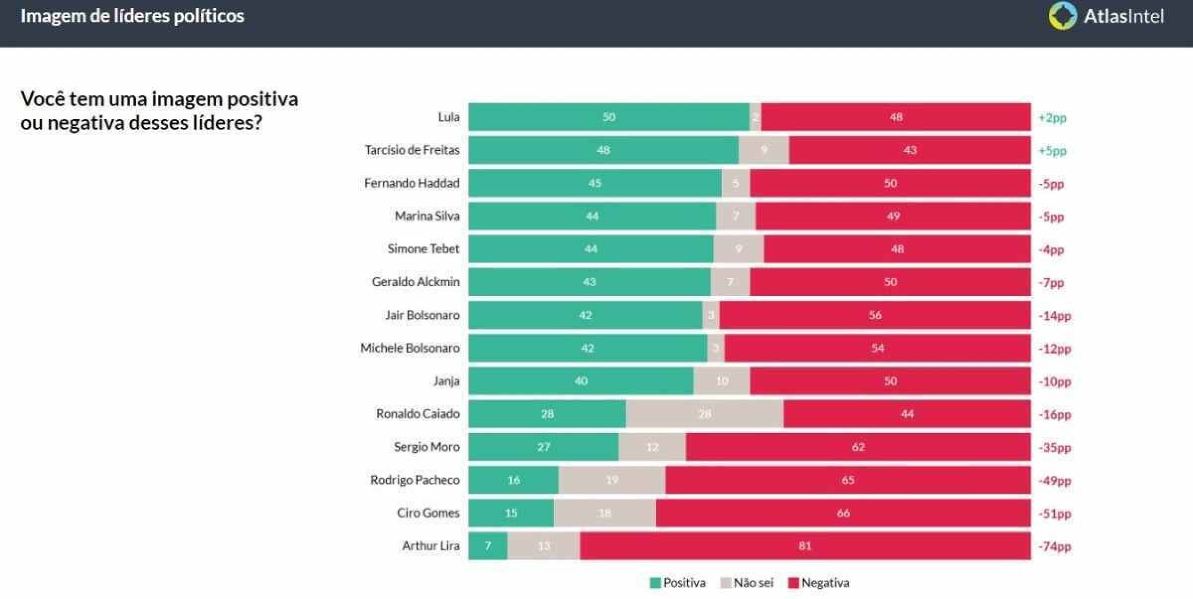 Esta análise resume os principais pontos de uma pesquisa realizada pelo Instituto Atlas sobre a imagem de líderes políticos no Brasil, destacando as opiniões favoráveis e contrárias sobre os temas mais relevantes.