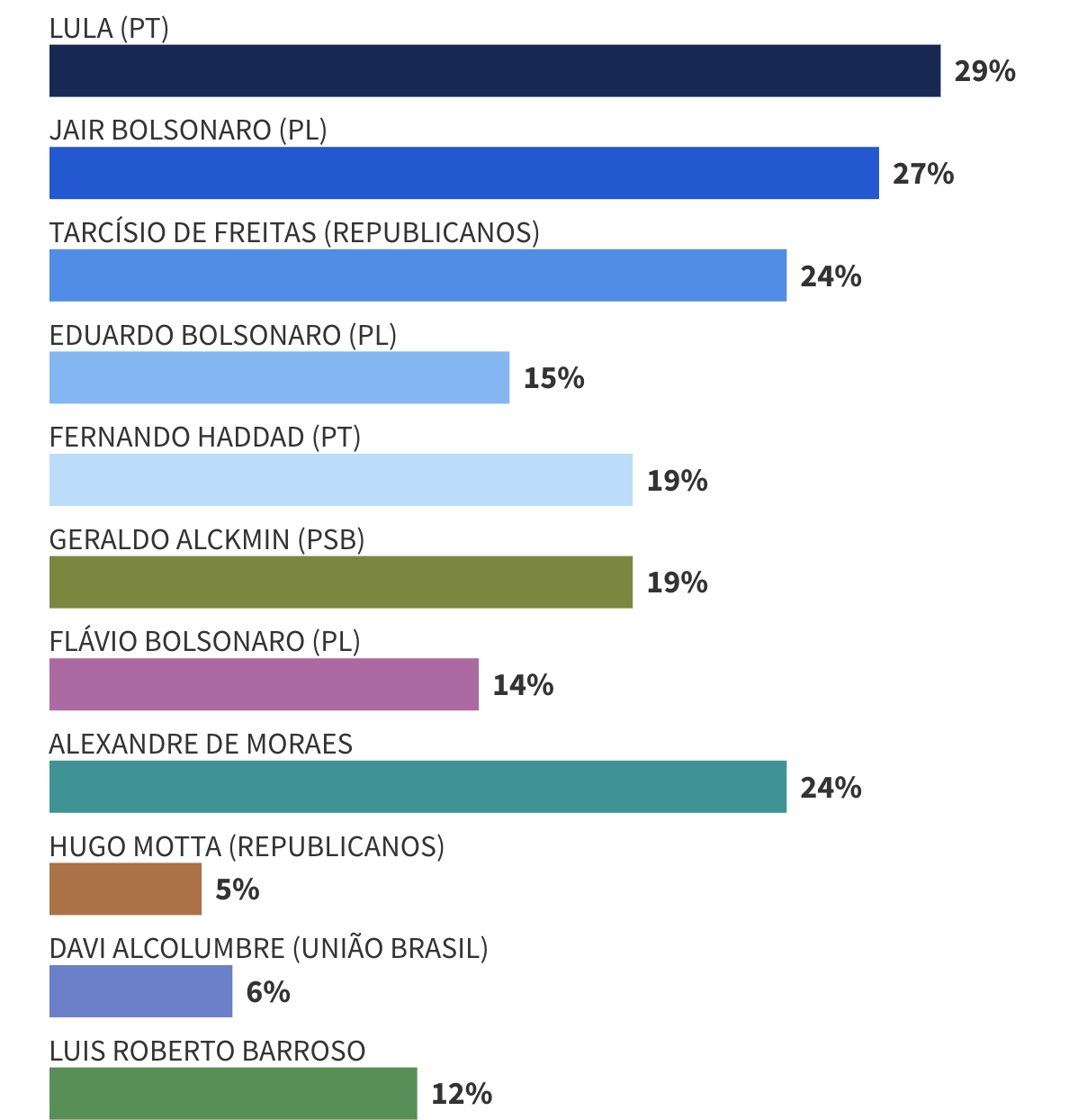 Outras figuras no ranking incluem o ministro do Supremo Tribunal Federal (STF) Alexandre de Moraes, em quinto lugar, com 24% de confiança elevada, mas 43% de desconfiança. À frente dele, está o ministro da Fazenda, Fernando Haddad (PT), com 19% de confiança elevada e 37% de desconfiança. Jair Bolsonaro ocupa a sexta posição, seguido pelo ministro Luís Roberto Barroso (STF). Os últimos lugares são ocupados pelos filhos de Bolsonaro, o deputado federal Eduardo Bolsonaro (PL-SP) e o senador Flávio Bolsonaro (PL-RJ)
