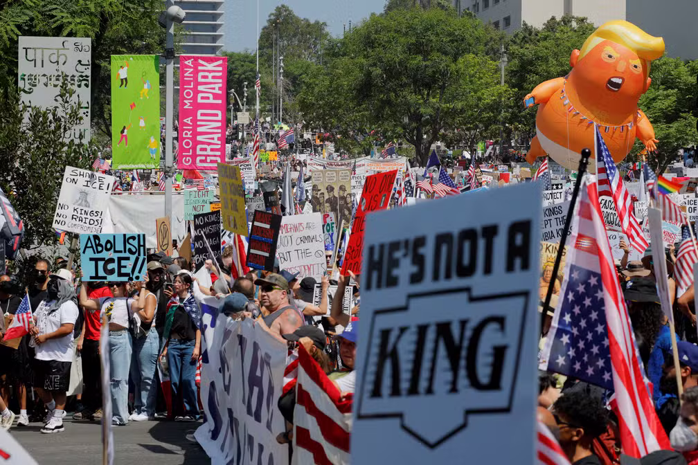 Palavras-chave: No Kings Day, Donald Trump, protestos, parada militar, imigração, Washington DC, Dia da Bandeira, Exército dos EUA, polarização, deportações