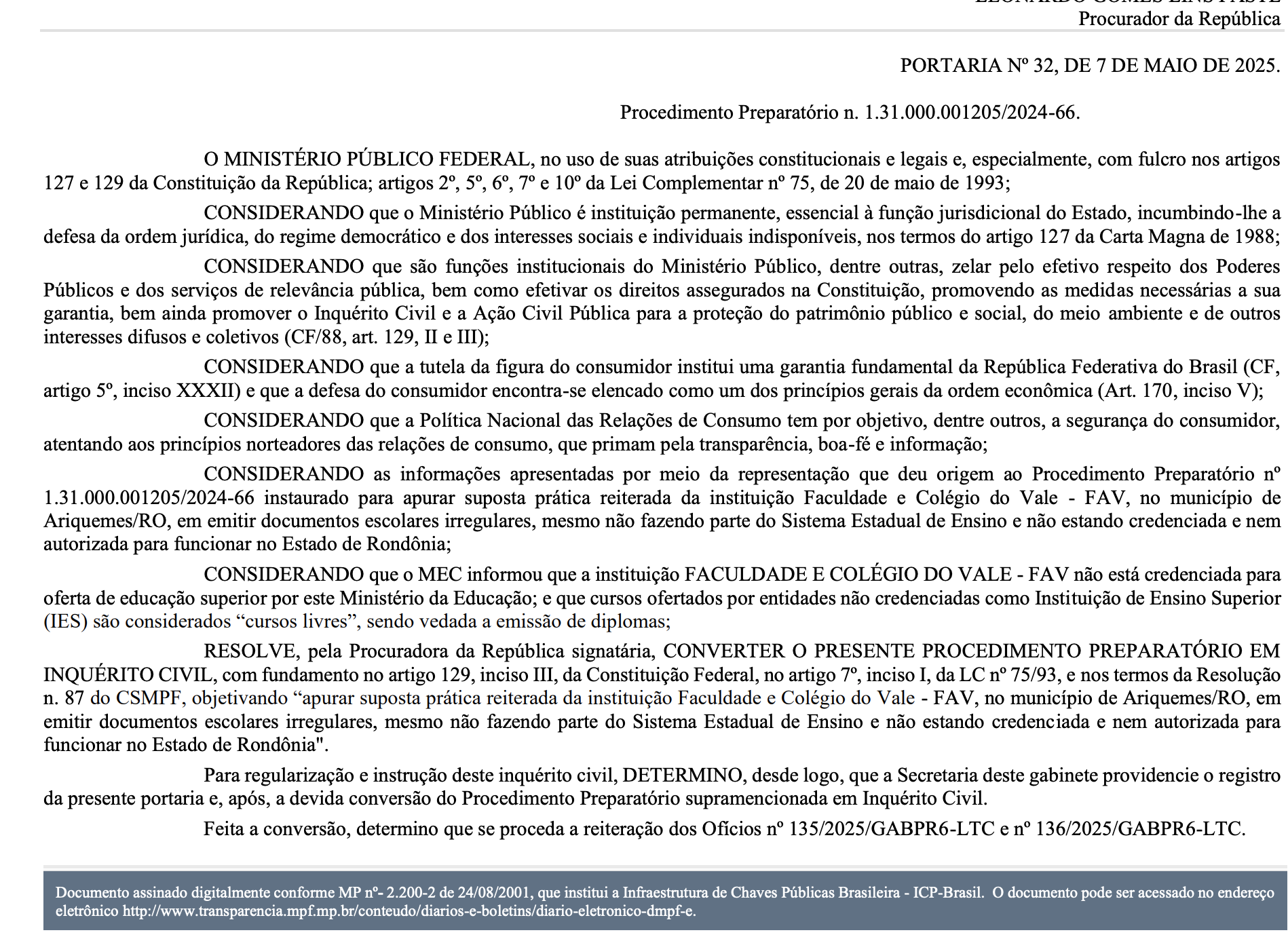 O Ministério Público Federal (MPF) instaurou um inquérito civil para investigar a Faculdade e Colégio do Vale (FAV), localizada em Ariquemes, Rondônia, por suposta emissão reiterada de documentos escolares irregulares. A ação, formalizada por meio do Procedimento Preparatório nº 1.31.000.001205/2024-66, foi convertida em inquérito com base no artigo 129 da Constituição Federal, que atribui ao MPF a defesa da ordem jurídica, do regime democrático e dos interesses sociais e individuais indisponíveis.