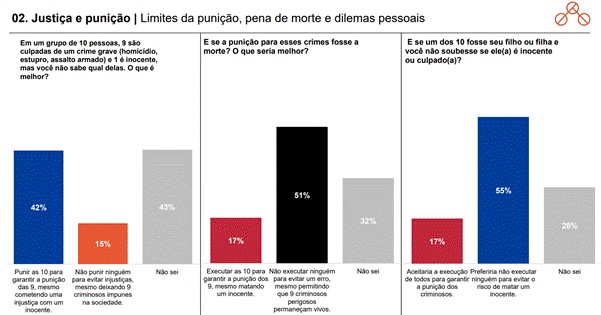 Um dos eixos centrais da pesquisa aborda a percepção social sobre justiça e punição. Segundo os dados divulgados, 42% dos entrevistados afirmaram preferir punir todos os possíveis envolvidos em um crime, mesmo sabendo que um deles é inocente, a correr o risco de deixar os culpados impunes.