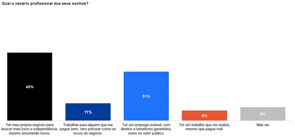 No campo econômico e do trabalho, a pesquisa descreve uma convivência entre o desejo por autonomia e a busca por segurança. Segundo os dados apresentados, 43% dos brasileiros afirmaram sonhar em empreender, enquanto 31% priorizam a estabilidade no emprego e 11% a garantia de um bom salário. Apenas 6% declararam priorizar um trabalho que traga realização pessoal, mesmo que a remuneração seja baixa.