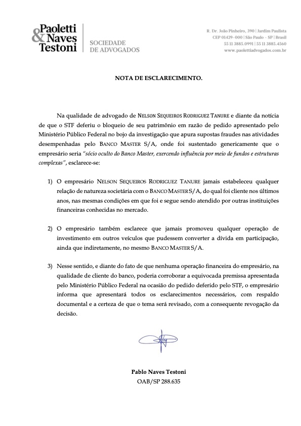 Na manhã desta terça-feira, 20, a assessoria de Tanure encaminhou nota afirmando que o empresário "jamais estabeleceu qualquer relação de natureza societária com o Banco Master. Confira a íntegra: