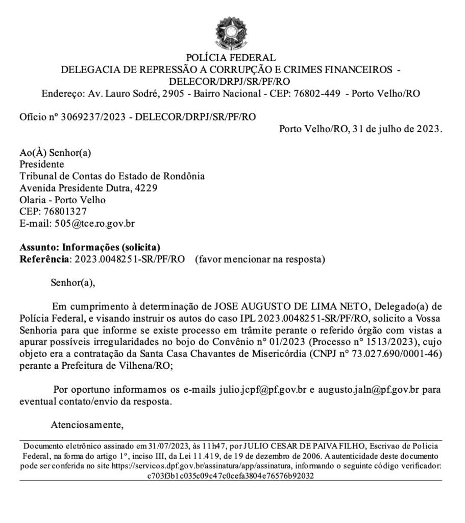 Um ofício da Polícia Federal encaminhado ao Tribunal de Contas do Estado de Rondônia, solicitando informações sobre o contrato da prefeitura de Vilhena com a Santa Casa de Misericórdia de Chavantes passou a circular nos grupos de Whatsapp da cidade.