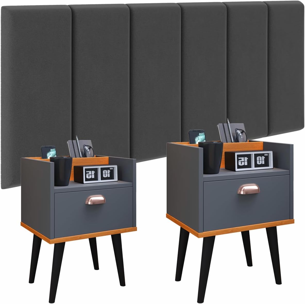 Conjunto Cabeceira Cama Casal 1,40 Com kit 2 Criado Quarto Milena (Cinza - Cinza/Cinamomo) - R$233,91