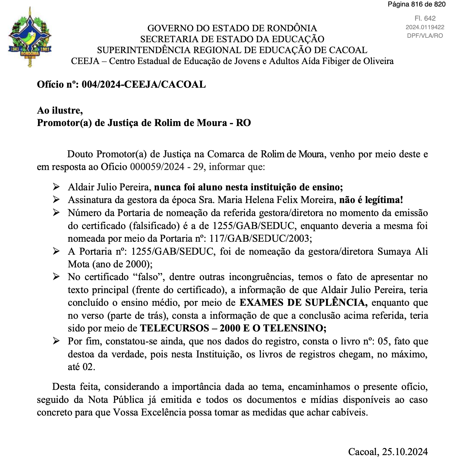A denúncia, feita pela cúpula do Partido Liberal (PL), aponta que o documento teria sido emitido pelo Centro Estadual de Educação de Jovens e Adultos (CEEJA) Aída Fibiger de Oliveira, em Cacoal (RO), mas a instituição nega qualquer registro de que Aldair tenha sido seu aluno. Caso a fraude seja confirmada, o prefeito pode perder o mandato e enfrentar responsabilização criminal por falsidade ideológica