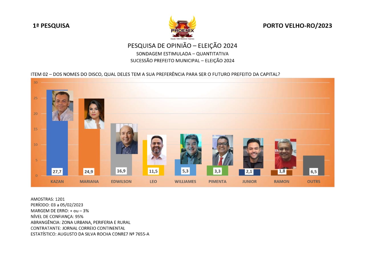 O Instituto Phoenix divulgou nesta terça-feira, 7, uma sondagem para a prefeitura de Porto Velho em 2024. A pesquisa possui três perguntas e foi realizada com 1.201 eleitores entre os dias 3 a 5 de fevereiro com margem de erro de 3% para mais ou para menos.