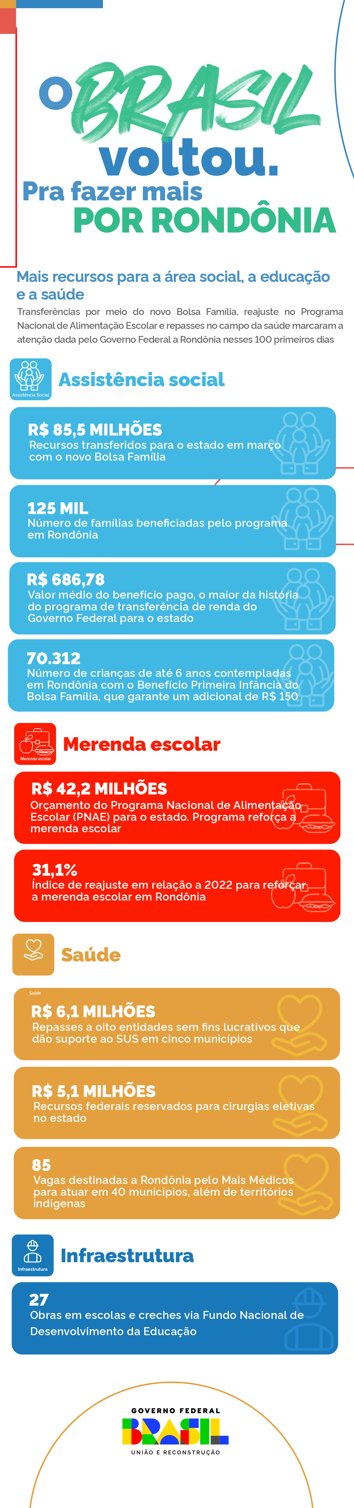 Investimentos na área social destinados ao enfrentamento da pobreza, melhoria da qualidade das merendas escolares e garantia de investimentos na saúde marcaram o suporte do Governo Federal a Rondônia nos 100 primeiros dias do terceiro mandato do presidente Luiz Inácio Lula da Silva.