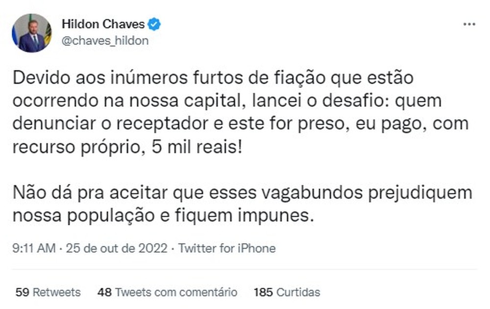 Segundo postagem feita em sua conta oficial no Twitter, quem denunciar furto de fiação e o suspeito for preso, Hildon chave diz que vai pagar, com recurso próprio, R$ 5 mil para o denunciante.